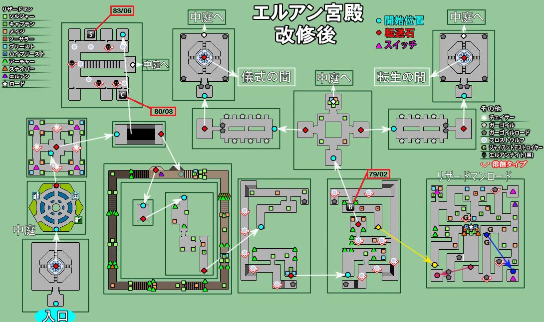| 079 | エルアン宮殿02 | B | 55 | 次元の歪み | リザロ地帯行き転送石の部屋入り口入ってすぐ。 | 次元の歪みからリザ無限沸き(上限有り)。 次元の歪みを倒すとPOP停止で宝箱をタゲれる。 火力軍団で突っ込んで一気に歪みを叩くとGOOD。 |