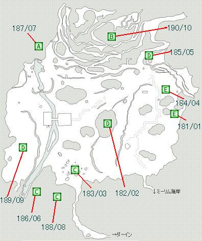 | 003 | ミーリム海岸03 | B | 55 | ナメクジ(大)*9 | エイシス入り口方面クロウラーがいるとこ。 | |