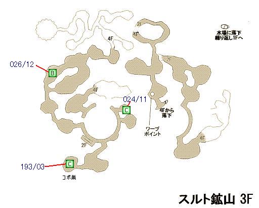 | 026 | スルト鉱山12 | B | 55 | 骨*5先生混合 | キングルート3F。バジ地帯二又の南側。 | |